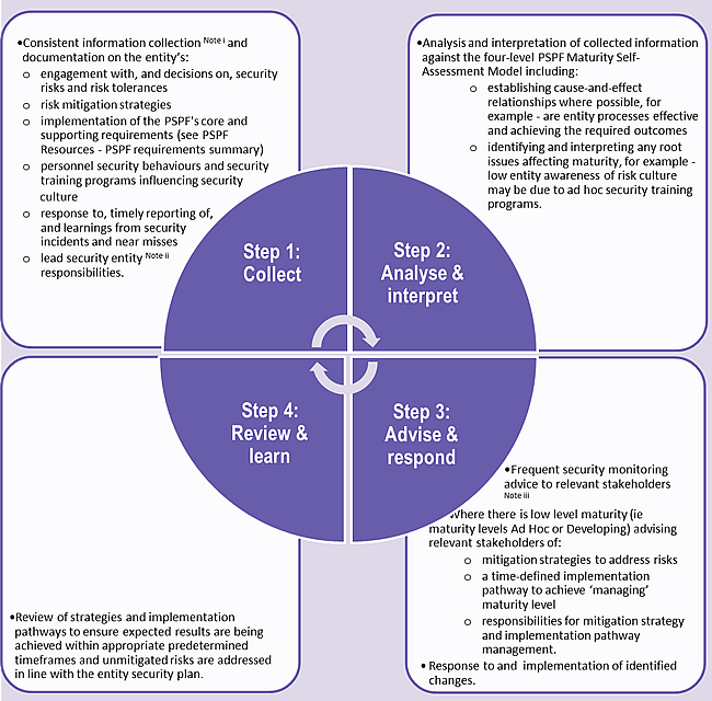 Security maturity monitoring is a continuous cycle and the information collected informs the entity security plan and the PSPF policy: Reporting on security.